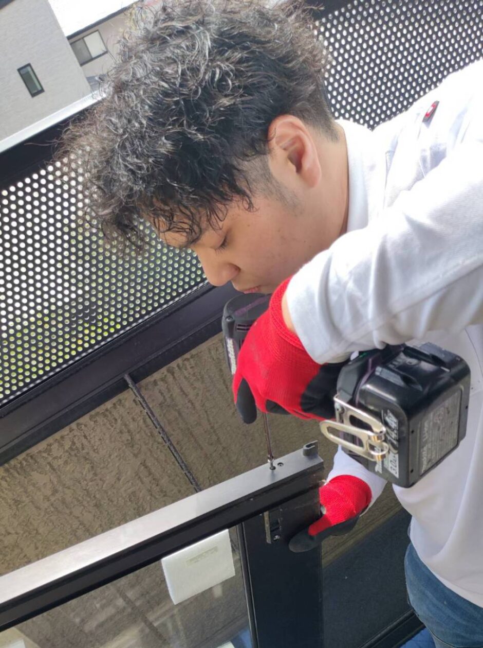 引き戸分解によるガラス交換。雨天時も安全に配慮して施工しています。