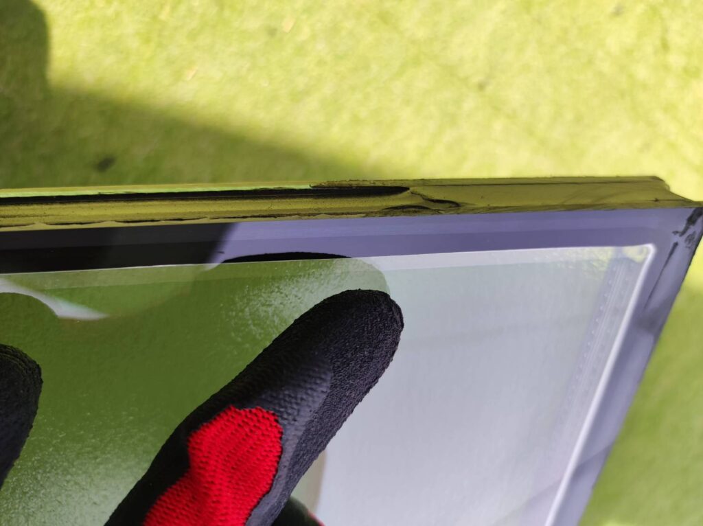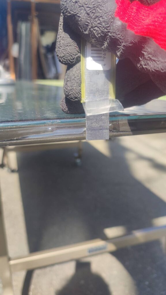 ガラスの縁に直尺を当てて、総厚・空気層・ガラス厚を確認します。
