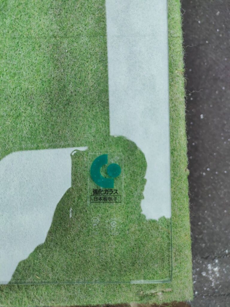 強化ガラスには、右下などにメーカー表示や「強化ガラス」表記があることが多いです。店舗ドアなどは安全性の関係で強化ガラスが使用されているケースが多く見られます。
