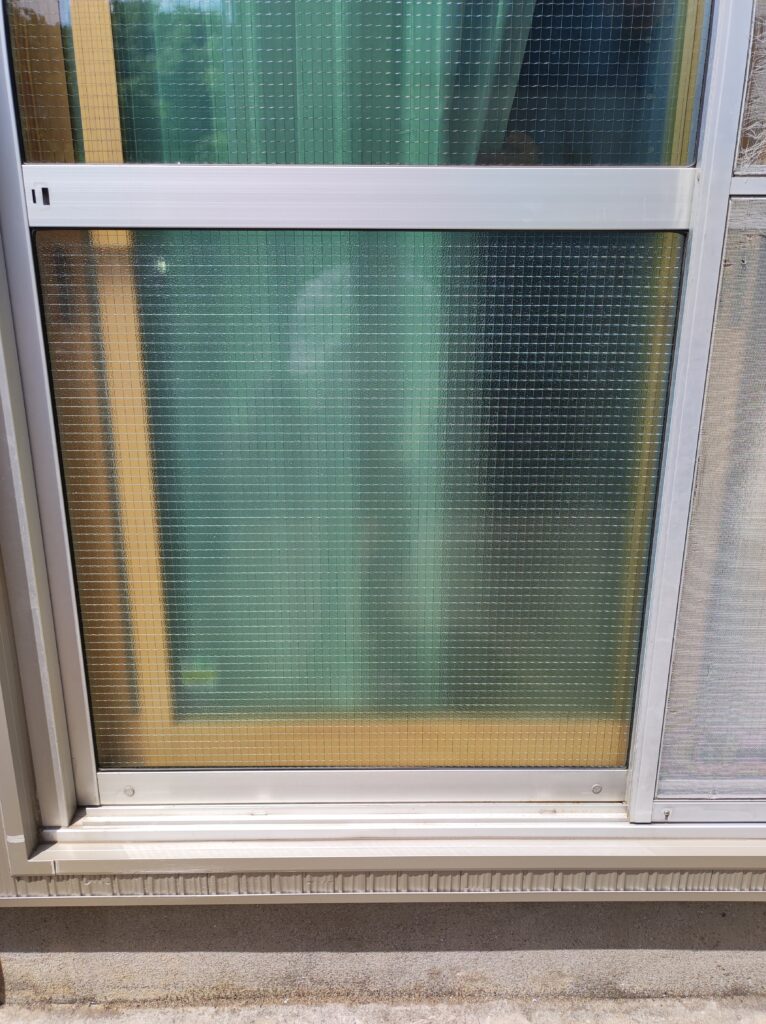飛散防止対策にすりガラスから網入りガラスにしました。網入りガラスには、菱網・縦網・クロスワイヤーの3種類の網目パターンがあります。