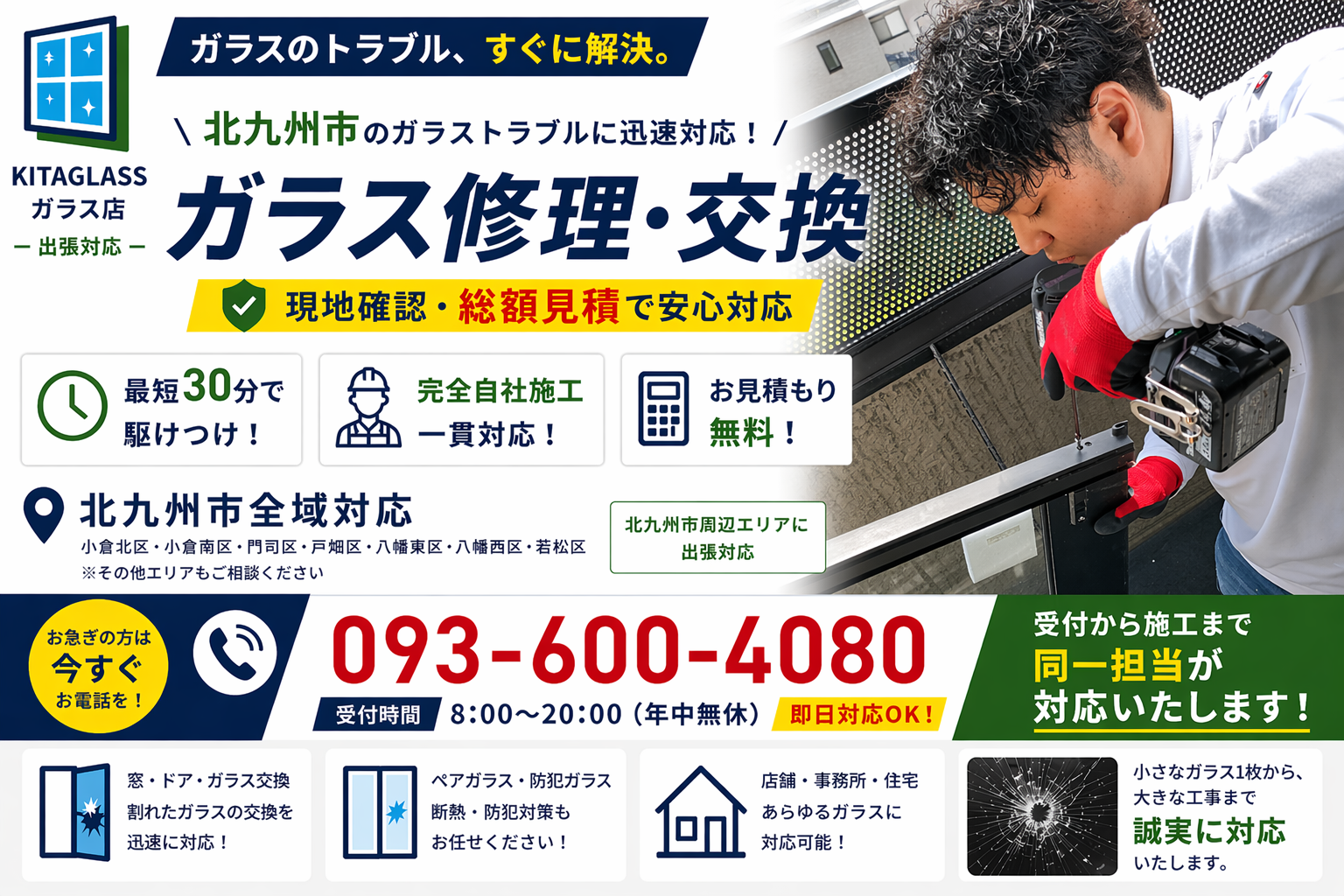KITAGLASSは、北九州市一円(小倉北区・小倉南区・門司区・戸畑区・八幡東区・八幡西区・若松区)で、窓ガラス割れ修理・ガラス交換に対応している出張修理専門のガラス屋です。